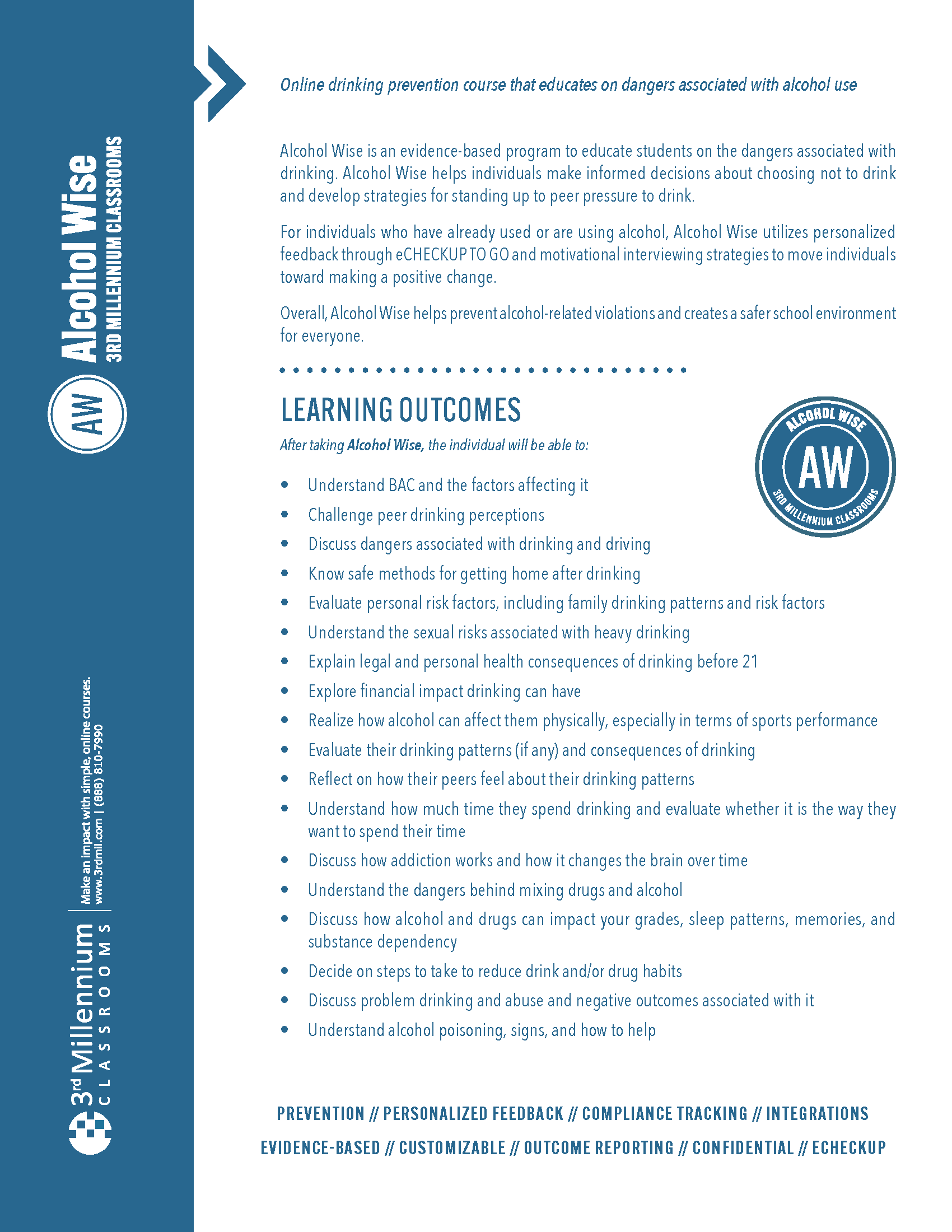 Alcohol Wise educates students on the risks of alcohol use and helps them make informed decisions through interactive content, personalized feedback via eCHECKUP TO GO, and motivational strategies.